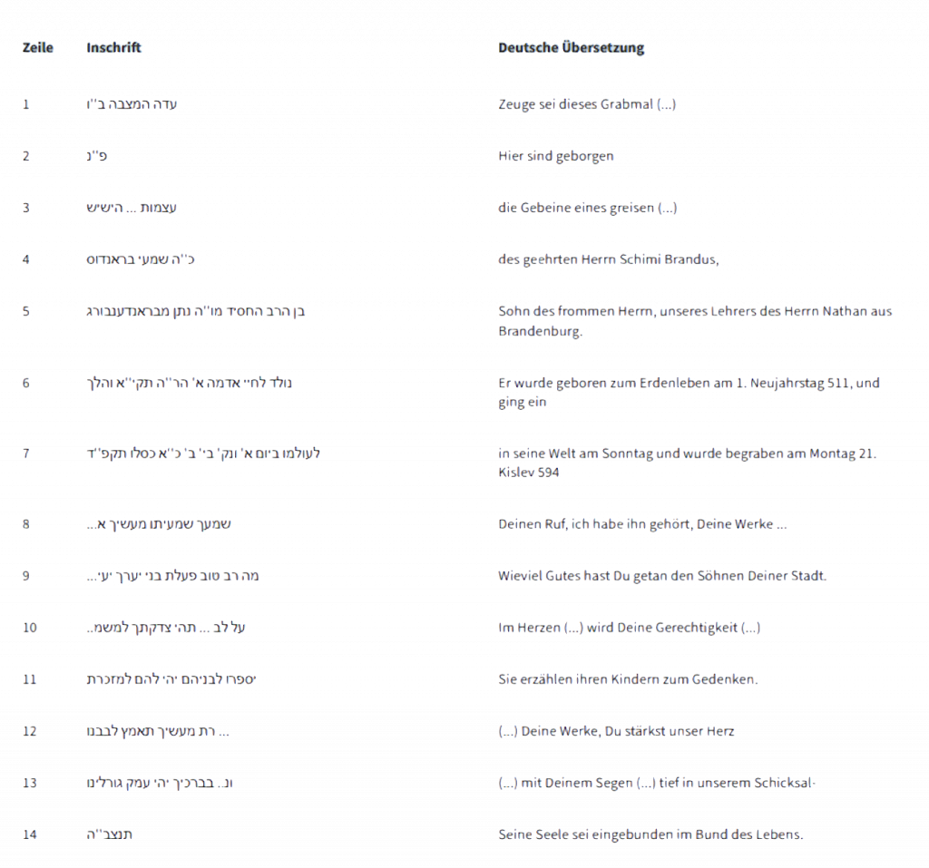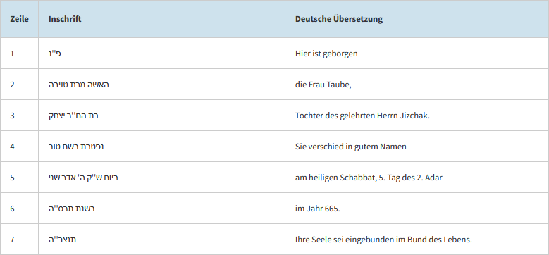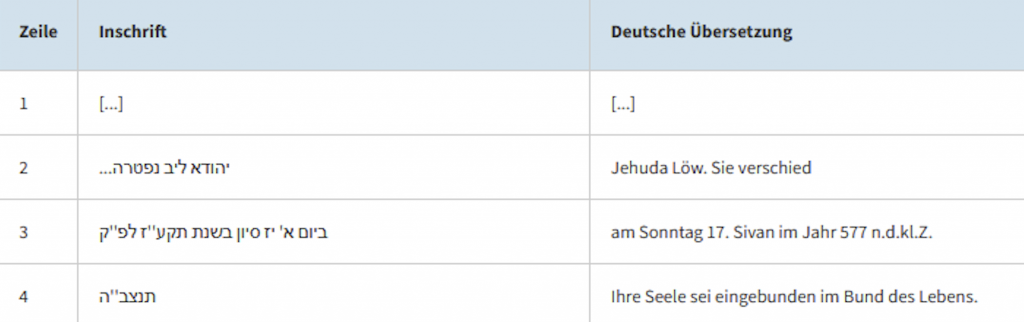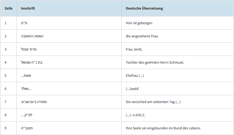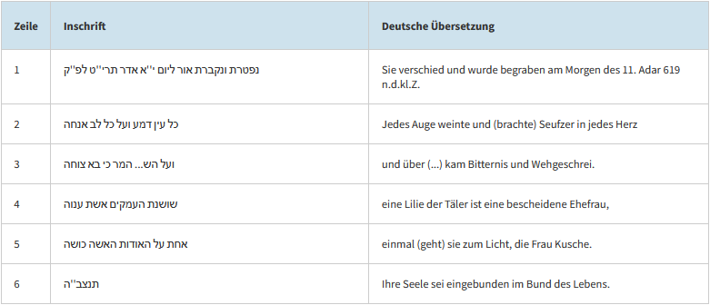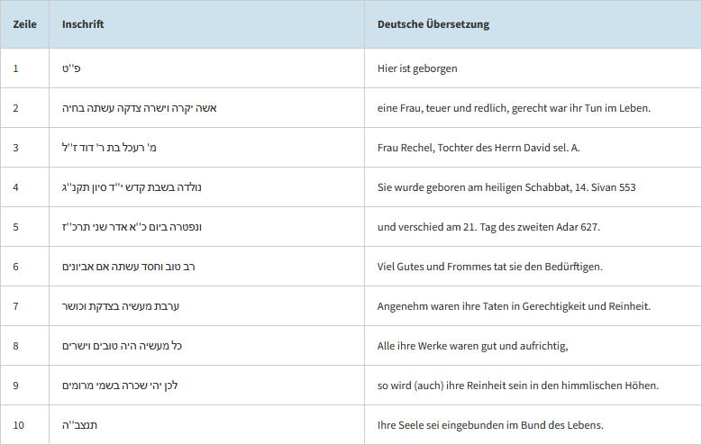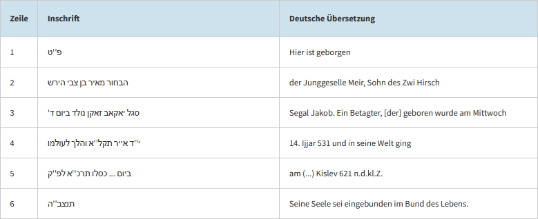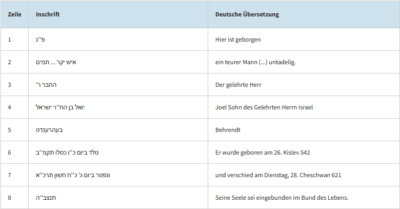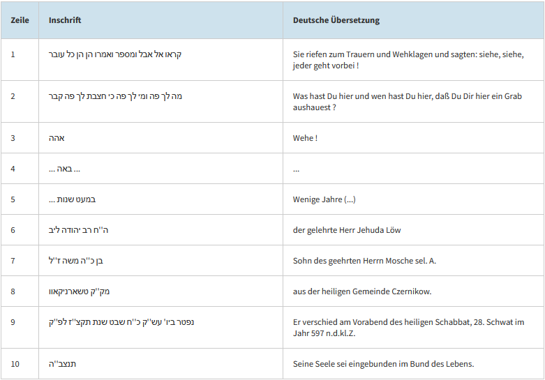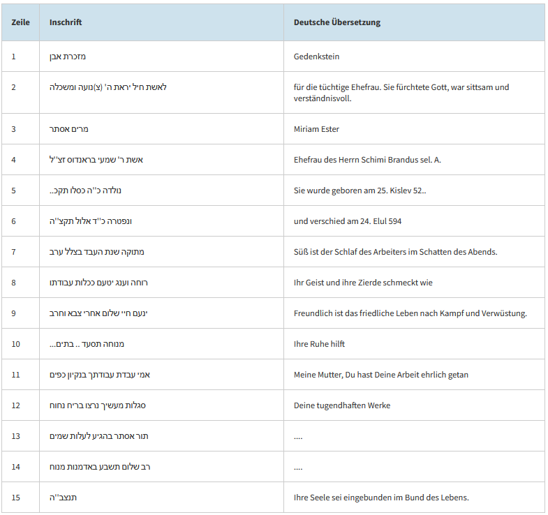 Dieser Bereich zeigt die hebräischen Inschriften mit deutscher Übersetzung zu jedem Grab.