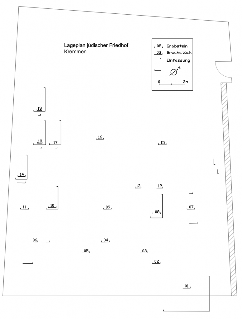 „Ein Plan der Anlage des Jüdischen Friedhofs in Kremmen mit der Lage der erfassten Grabsteine ist hier zu finden. Erstellt wurde er von Michael Schmitz im Jahr 2017. Die Erfassung und Kommentierung der Grabstein-Inschriften erfolgte durch Brigitte Heidenhain.“ Quelle [4]